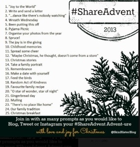 This year I’m planning on joining in with Skin and Blister’s #ShareAdvent. She has provided a prompt for each day in the run up to Christmas Day. You can join in by blogging, tweeting or instagraming.