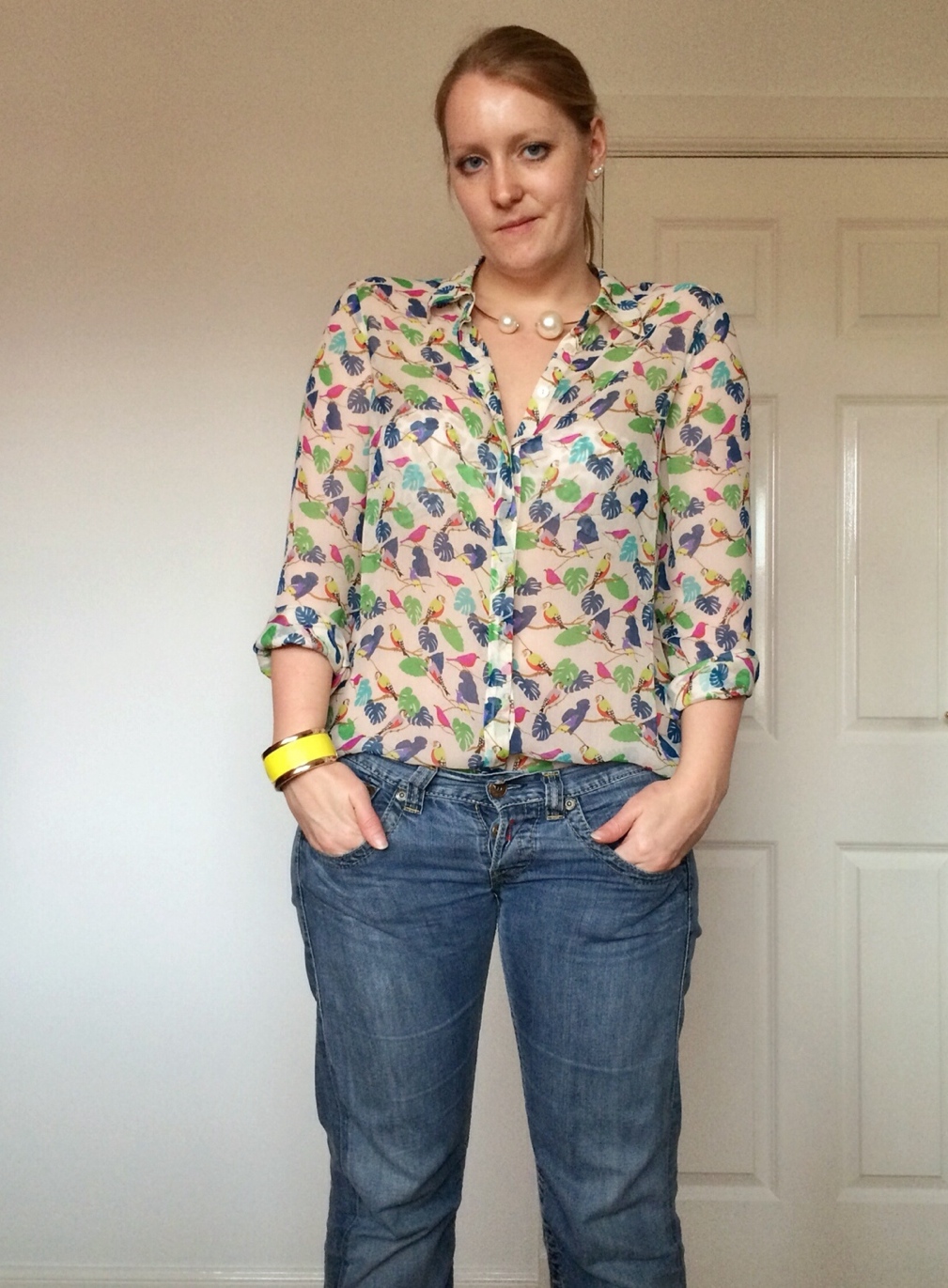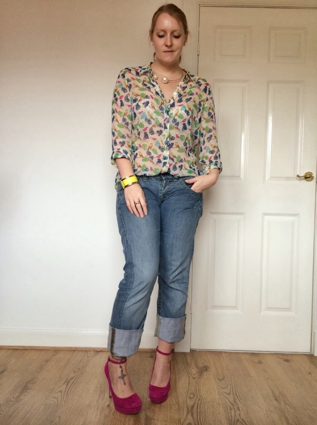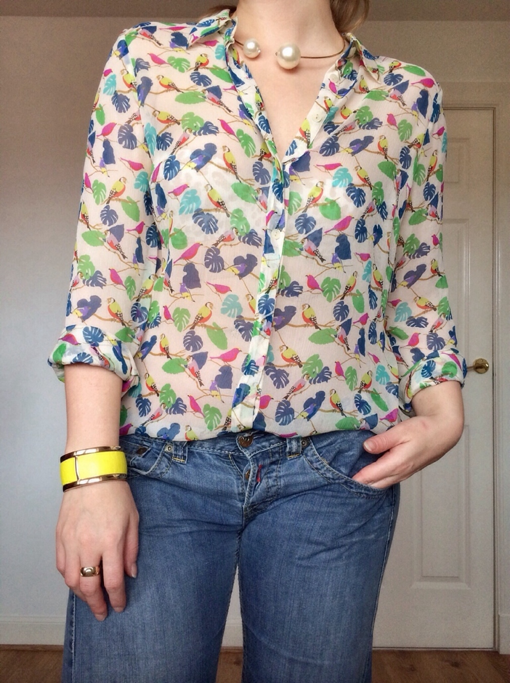 I got a lot of things from my mother and dress sense is most definitely one if them. And although she’s now a Gran she’s still knows how to rock a good outfit, though her taste in shoes is going downhill (a strong sway towards the comfortable these days!) This shirt is a perfect example, I got it from her when was visiting during the week it couldn’t be more on trend if it tried with the sheer silk and tropical print.