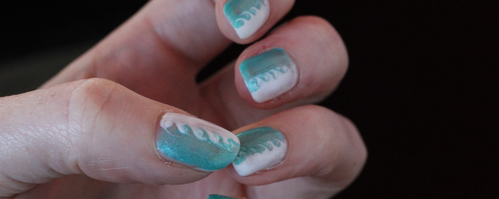 Not to difficult to create, the hardest part is getting enough polish on your nail to swirl but not too much that it drips all over your finger. Start by painting half your nail a light colour and the other half a darker colour. Then quickly swish a dotter tool or pointed bamboo stick around where the two colours meet before it dries. It’s maybe easier to do this with shellac as it doesn’t set without curing but it’ll work with normal nail varnish so long as your quick.
