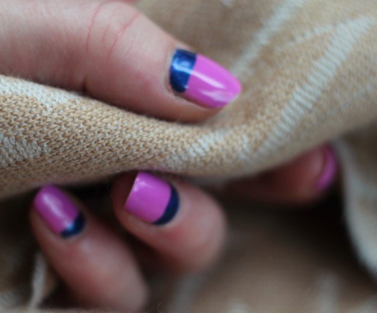 Now the snow has left us it’s so dull and grey that I needed a little colour to brighten my day. I went for clashing blue and pink. I did these the hard way painting the darker colour on the bottom; to keep it easy paint the dark colour on top, trust me far less fidgety. As my nails are so horribly short though having the dark on the bottom helps lengthen them, even if just a little bit.