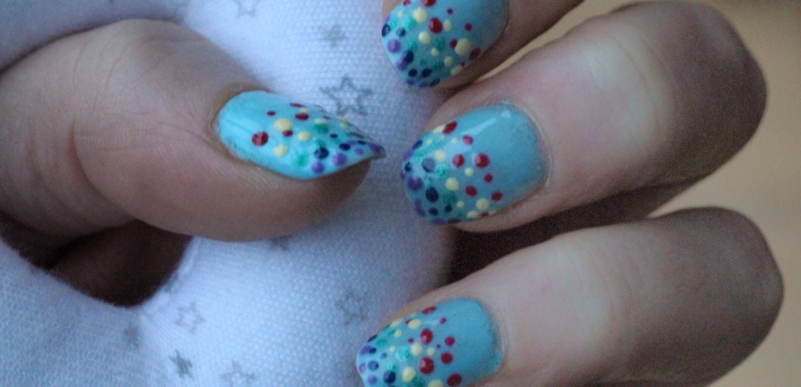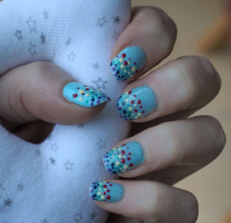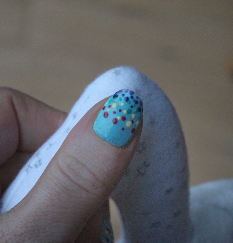 Rainbows are probably the most apt for Scottish spring, sunny one minute pouring rain the next. This little dotted design is a simple way to recreate them on your nails. Though this design didn’t take long you may notice only my left hand is featured in these photos. Turns out you only have time to add nail art to one hand with a newborn so the the right hand is plain blue.